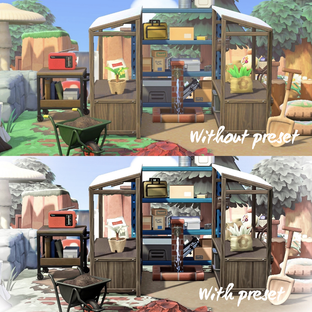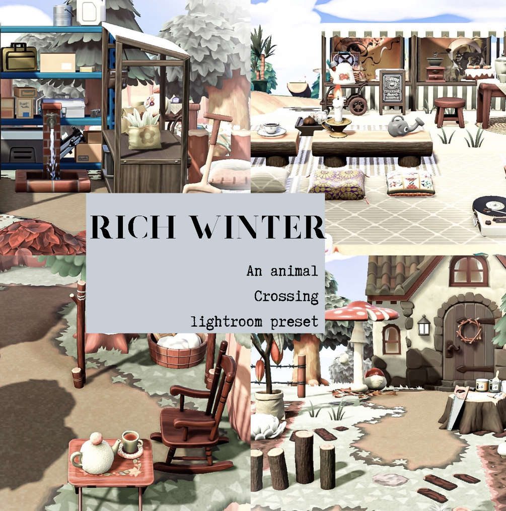 𝑟𝑖𝑐ℎ 𝑤𝑖𝑛𝑡𝑒𝑟 is is a Lightroom preset that turns animal crossing screenshots from their bright, primary colours into a deep rich filter with a frosty feel. This preset emphasises the darker tones within the image, as well as brightening the lighter tones, making it perfect for a winter themed island.