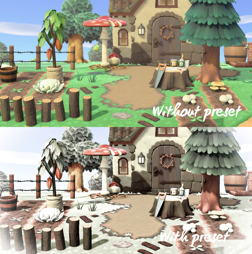 𝑟𝑖𝑐ℎ 𝑤𝑖𝑛𝑡𝑒𝑟 is is a Lightroom preset that turns animal crossing screenshots from their bright, primary colours into a deep rich filter with a frosty feel. This preset emphasises the darker tones within the image, as well as brightening the lighter tones, making it perfect for a winter themed island.